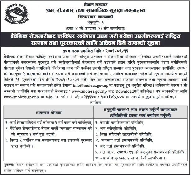 श्रम, रोजगार तथा सामाजिक सुरक्षा मन्त्रालयले वैदेशिक रोजगारीबाट फर्किएर स्वदेशमा उद्यम गरी बसेका उद्यमीलाई राष्ट्रिय सम्मान एवम् पुरस्कृत गर्ने भएको हो ।