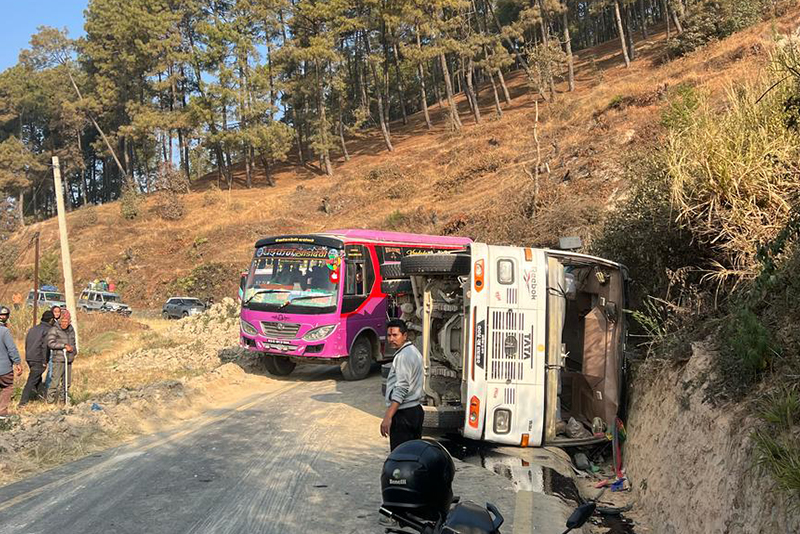 आफैँ अनियन्त्रित भई सडकको नालीमा पल्टिएर बस दुर्घटना हुँदा बसमा सवार चालक र सह–चालकसहित१७ जना घाइते भएका हुन्।
