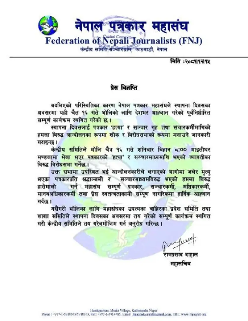 यस्तै महासङ्घले स्थापना दिवसका अवसरमा आजका लागि देशभर आह्वान गरेको पूर्वनिर्धारित सम्पूर्ण कार्यक्रम स्थगित गरेको छ । ‘स्थापना दिवसलाई पत्रकार ‘हत्या’ र सञ्चार गृह तथा सञ्चारकर्मीमाथिको हमलाविरुद्ध आन्दोलनका रूपमा शोक र विरोध शभाको रूपमा मनाउने’ महासङ्घका महासचिव रामप्रसाद दाहालले निकालेको विज्ञप्तिमा उल्लेख छ ।