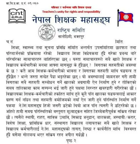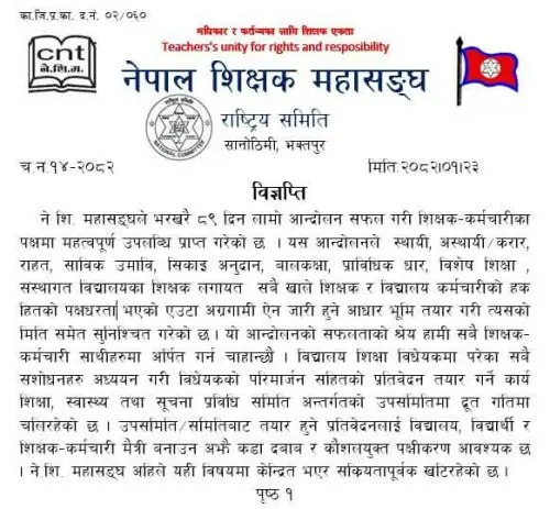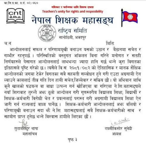 ‘विगतका सहमतिको अवस्था के छ ? कतै आम शिक्षक कर्मचारीको भावना र विगतका सहमति माथि षडयन्त्र त हुँदै छैन भन्ने जस्ता सन्देह पैदा भइरहेका छन्’, अध्यक्ष लक्ष्मीकिशोर सुवेदी र महासचिव तुलाबहादुर थापाद्वारा हस्ताक्षरित विज्ञप्तिमा भनिएको छ।