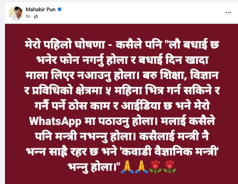 उनले सामाजिक सञ्जाल फेसबुकमा पहिलो घोषणा भन्दै लेखेका छन्, ‘मलाई मन्त्री नभन्नुहोला । कसैलाई मन्त्री भन्न साह्रै रहर छ भने कबाडी वैज्ञानिक मन्त्री भन्नुहोला ।’