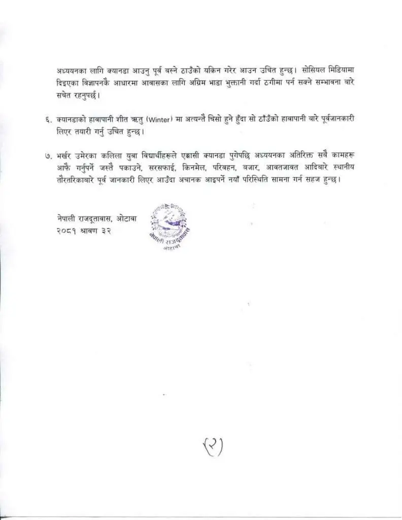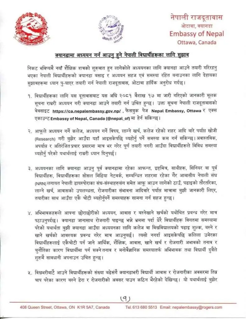 काठमाडौं ।क्यानडास्थित नेपाली दूतावासले पर्याप्त जानकारी र तयारी गरेर मात्रै अध्ययनका लागि क्यानडा आउन विद्यार्थी तथा अभिभाकलाई सुझाव दिएको छ । लहड र अरुको उक्साहटमा आउने विद्यार्थीले समस्या भोगिरहेको दूतावासले जनाएको छ ।