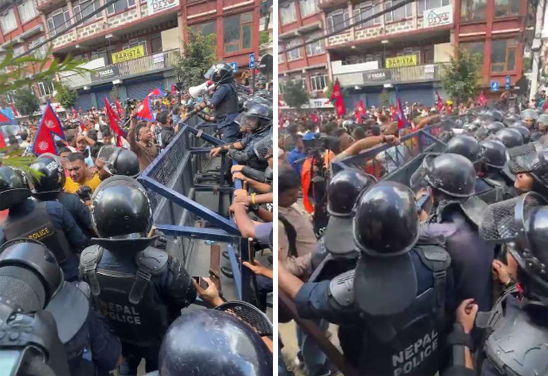 डा. निकोलस भुसाल, हेमराज थापासहितले निषेधित क्षेत्र तोड्न खोजेपछि प्रहरीले उनीहरूलाई रोक्ने प्रयास गरिरहेको छ ।